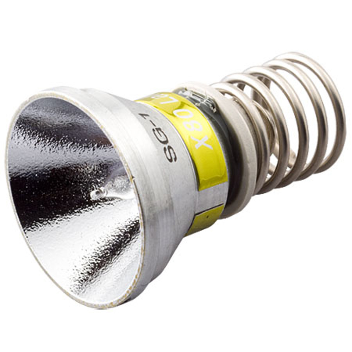 La lampe SureFire X80 est une lampe spécialement conçue qui, lorsqu’elle est combinée avec son réflecteur désigné et soigneusement conçu, produira le faisceau brillant et parfaitement focalisé de SureFire. Le réflecteur est soit intégré à la tête de votre lampe de poche, soit fait partie de l’ensemble de lampes préfocalisées.